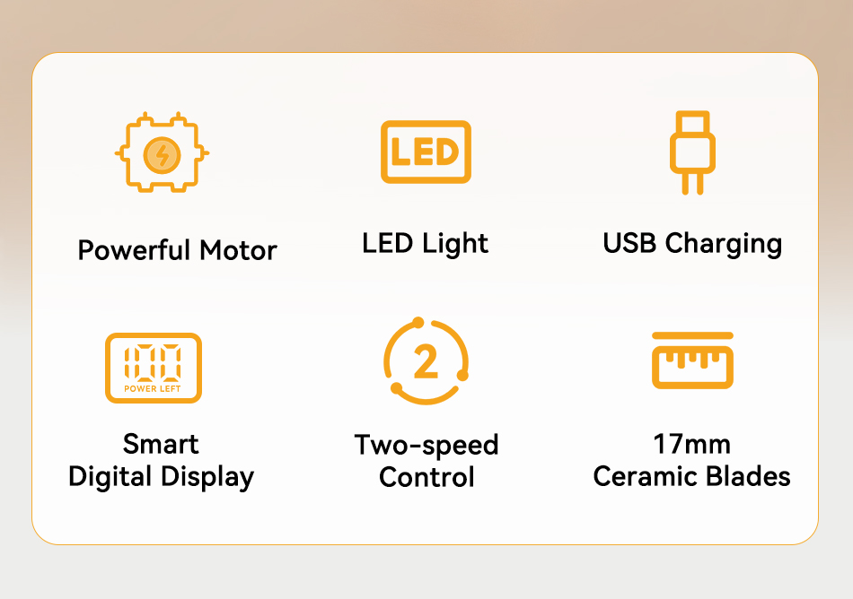 Function: LED Light / USB Charging / Stainless Steel & Ceramic Blades / 2 Working Modes / Powerful Motor